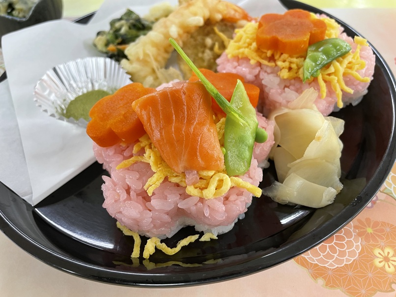 お花の形を模ったお寿司に彩り鮮やかな具材をのせて見た目もかわいく、お寿司の味もさっぱりとしていて「きれいで食べるのがもったいない」と喜んでくださいました。